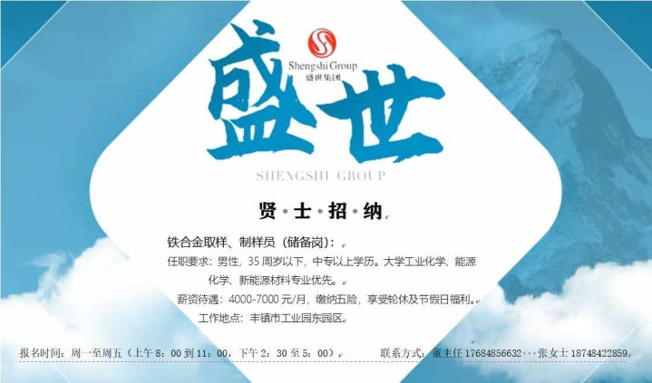 山西盛世集团岗位招聘铁合金取样、制样员(储备岗);任职要求:男性,35 ...