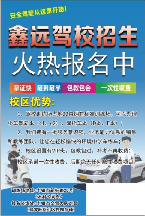 丰镇市鑫远驾校,招聘销售,教练若干名,前台文员一名,出纳一名。有意者...